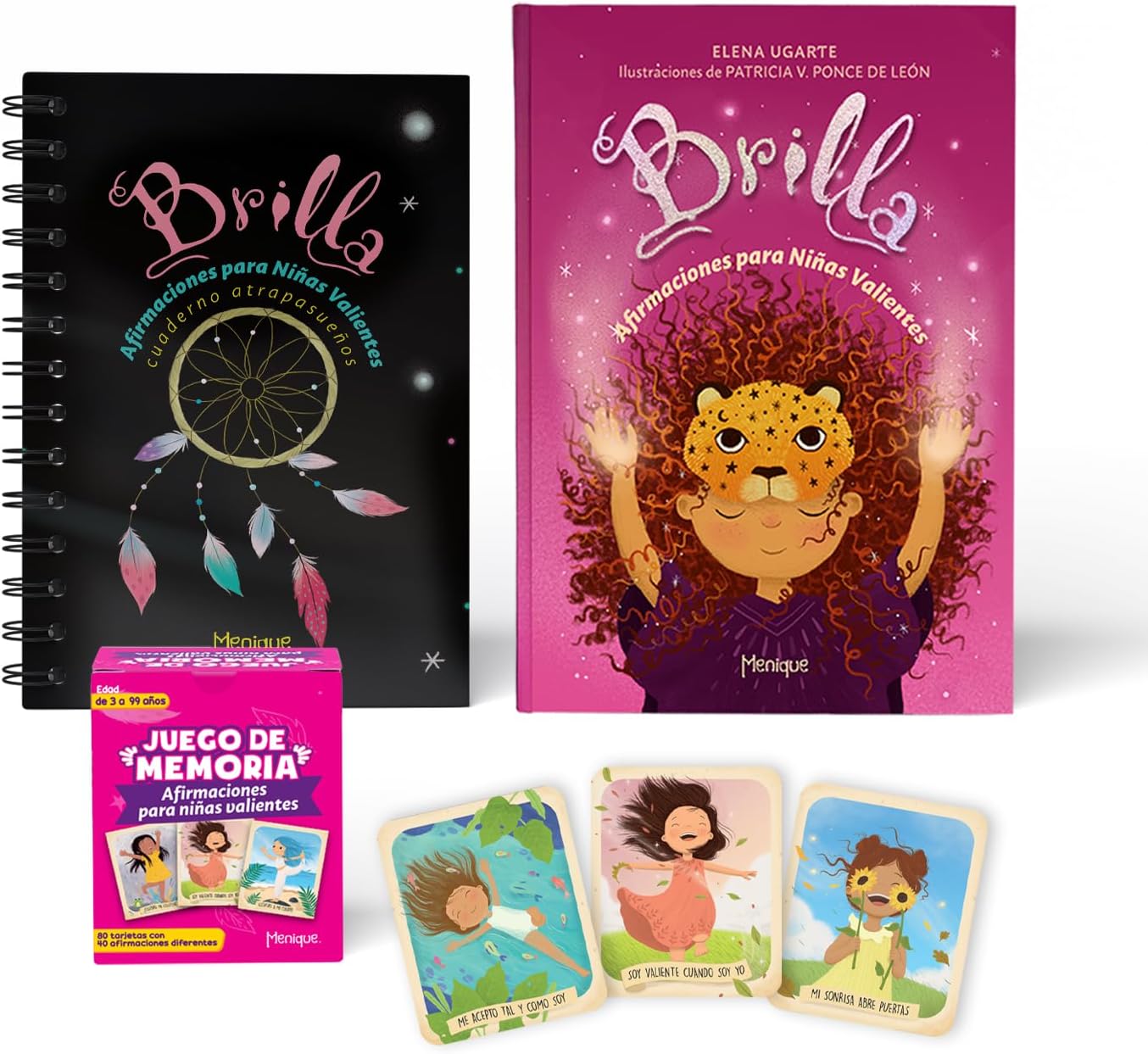 El paquete incluye el libro ilustrado Brilla, un cuaderno atrapasueños tipo diario y un juego de memoria con afirmaciones, todo presentado en una bolsa de manta estampada con frases inspiradoras. Perfecto como regalo consciente, este paquete invita a reconectar con lo esencial: ser una misma.